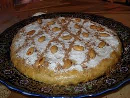 * ثم بعد اخراجها، نرشها بالسكر الصقيل، ونزينها بخطوط القرفة، وحبات اللوز المقلي.